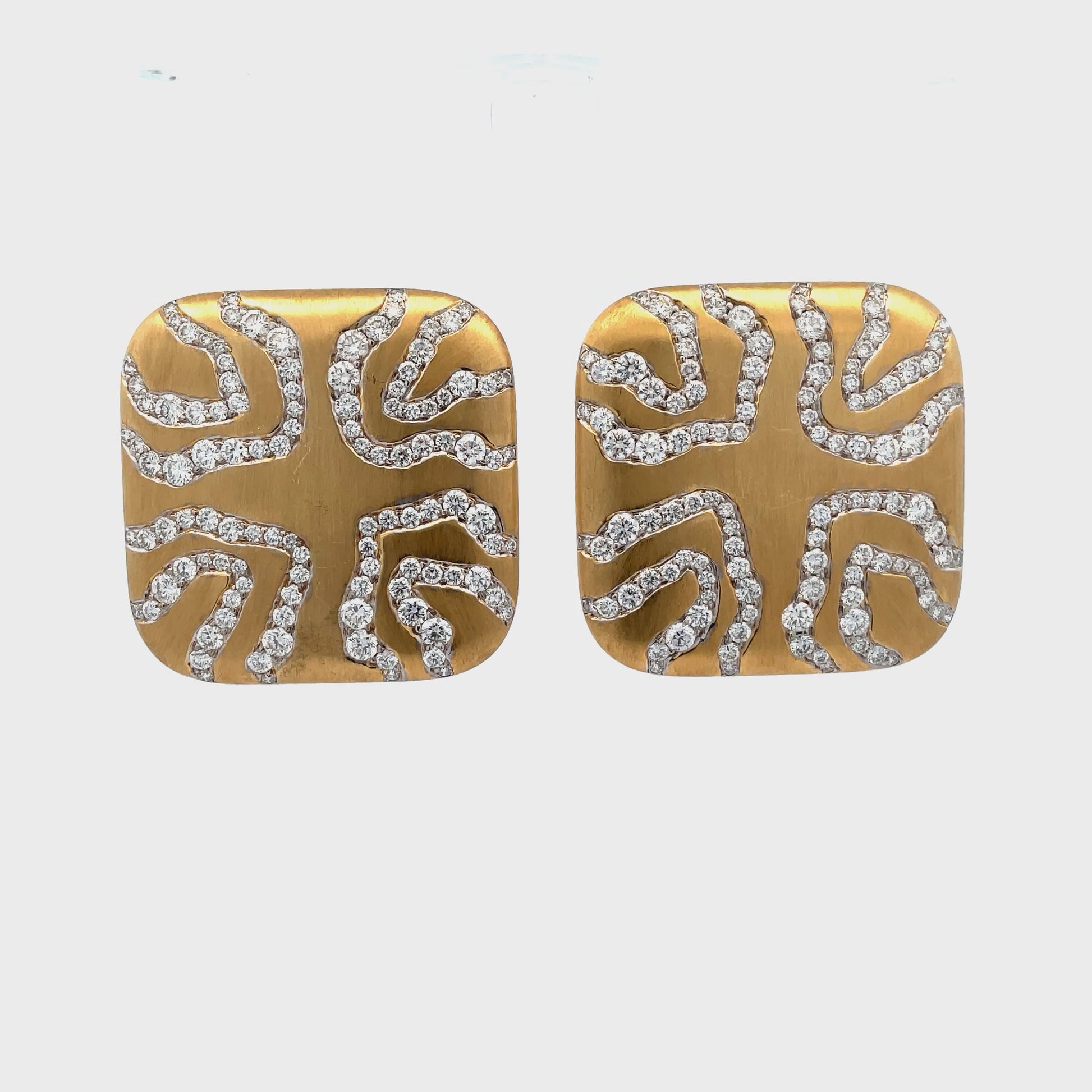 Brushed 18K gold earclips with flowing diamonds evoke river currents, combining timeless cushion shapes with graceful movement.