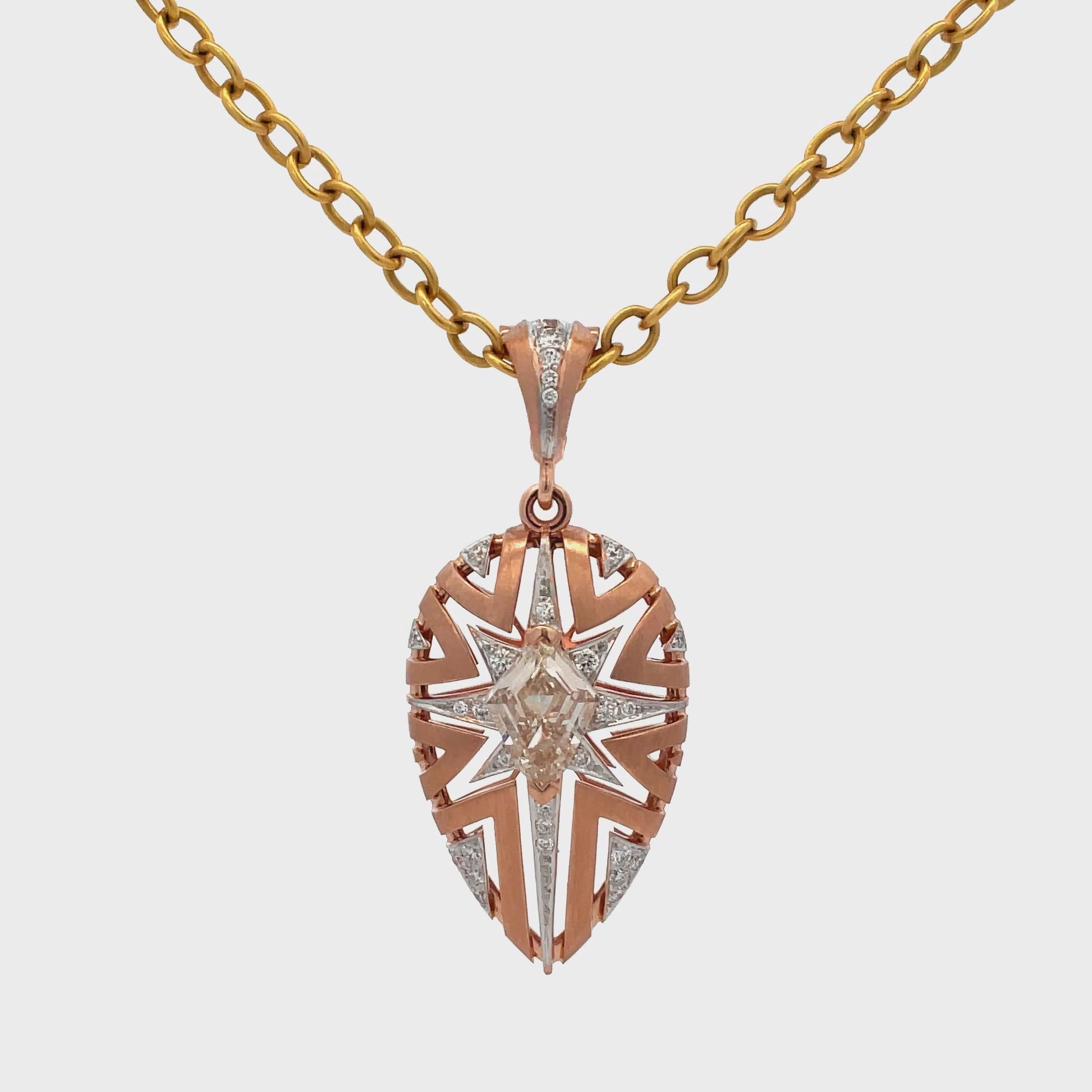 Flame-inspired pendant captures explosive energy, combining sharp Diamond geometry with radiant pavé detailing, symbolizing ignition and dynamic movement in rose gold.