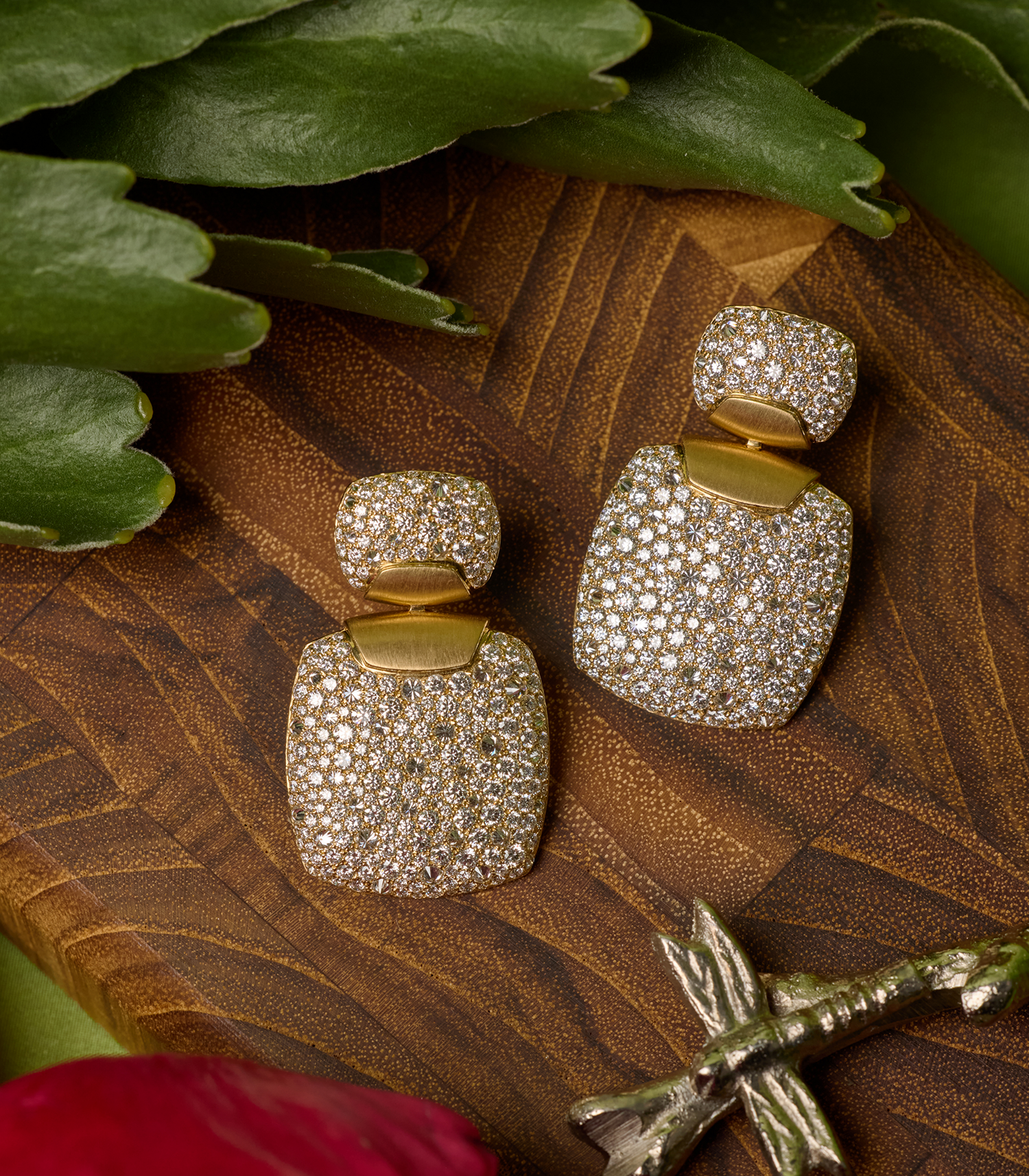 18K brushed white gold frames with reverse and traditional diamond settings create shimmering earrings inspired by lightning and celestial beauty.