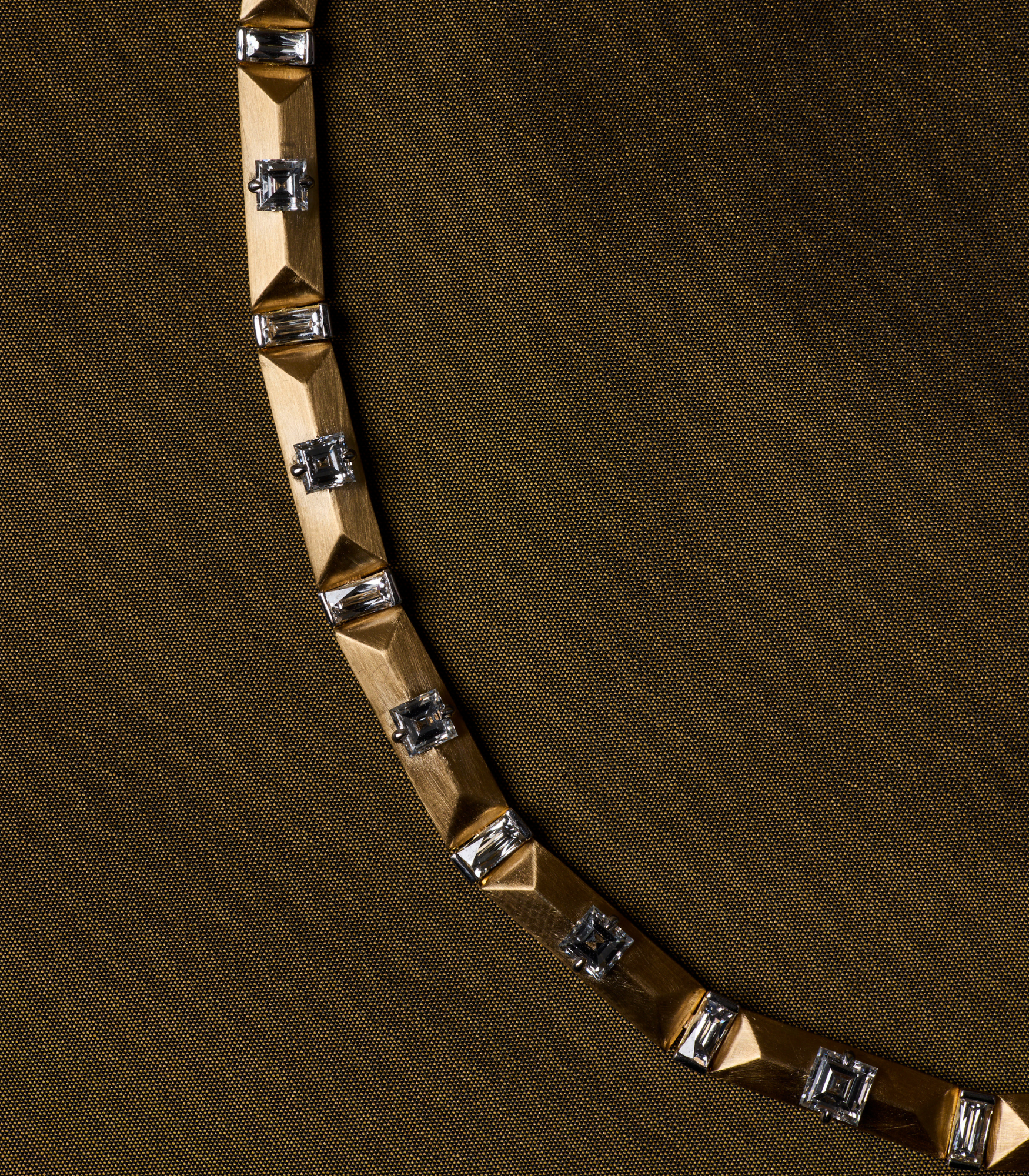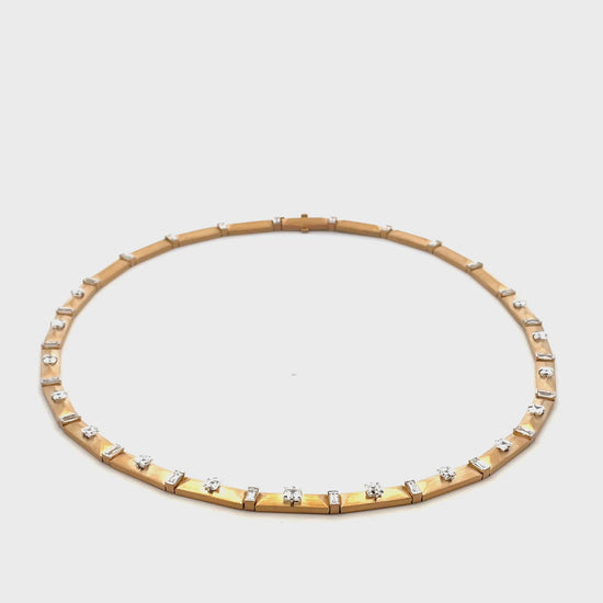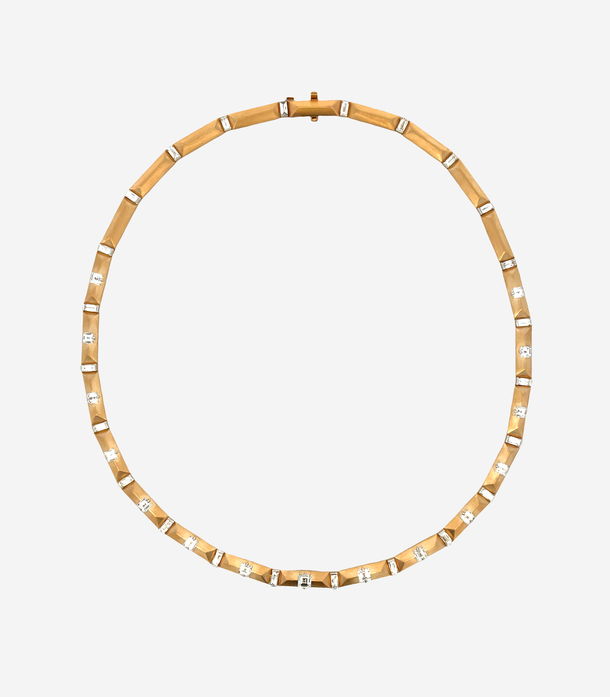 Enigma series necklace handcrafted in brushed gold, featuring Carré and French cut diamonds that balance clarity, symmetry, and timeless geometric refinement.