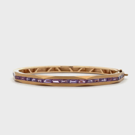 A yellow gold bangle with channel-set purple sapphire baguettes merges minimalist design with sculptural elegance and a subtle, shifting play of color.