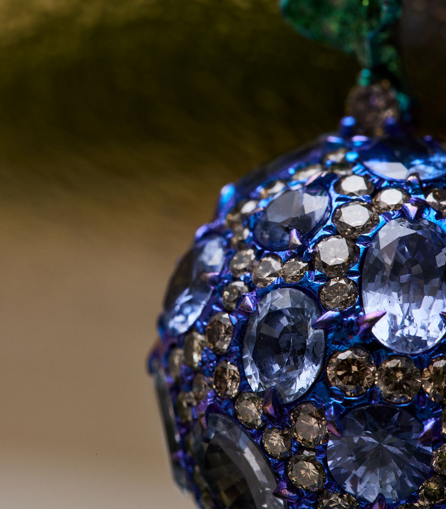 Steely blue sapphires in titanium settings, accented with green tsavorites, combine vibrant color, precision, and lightweight design.