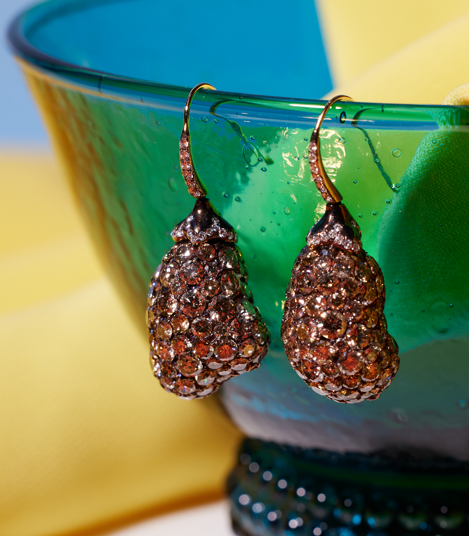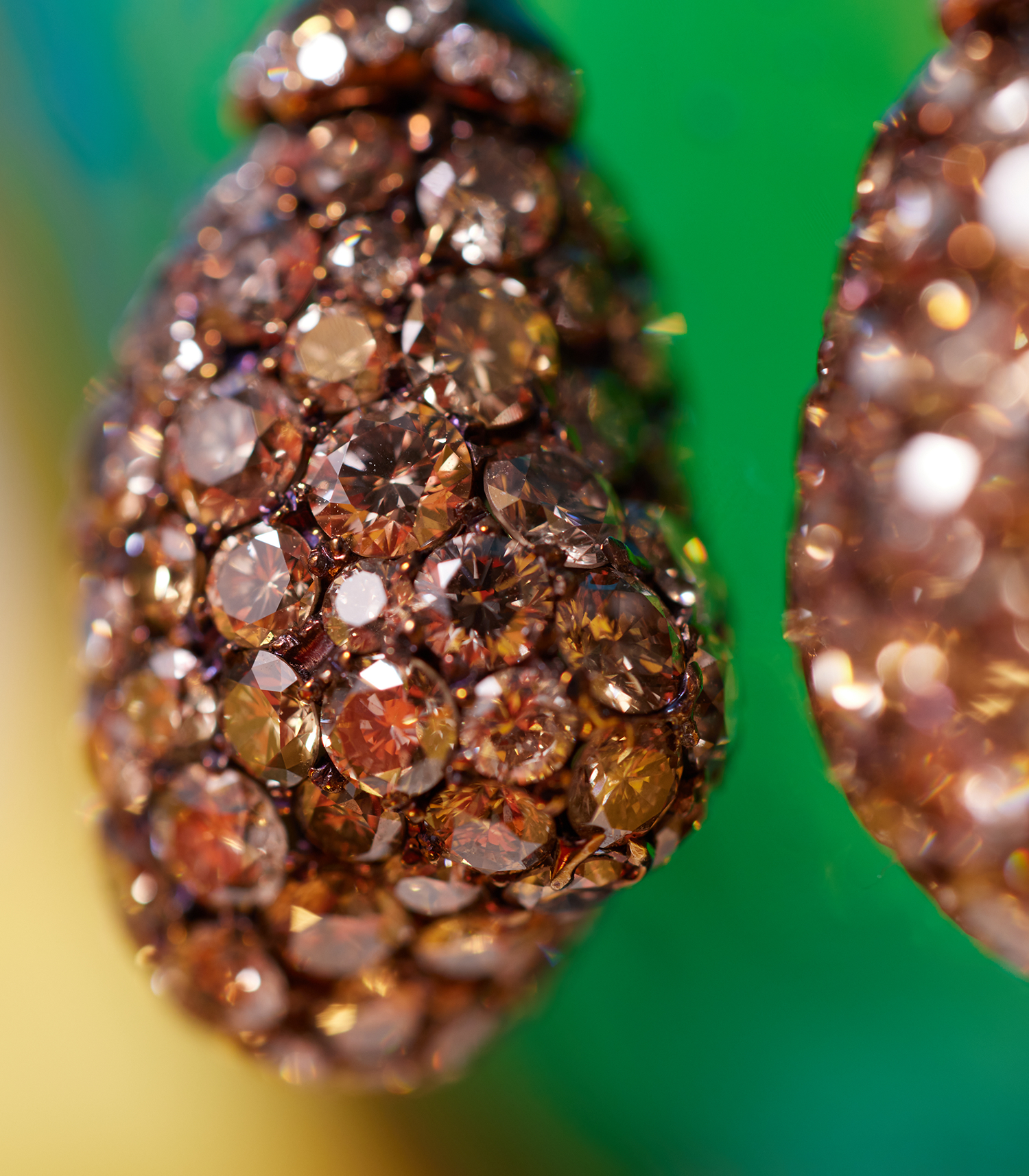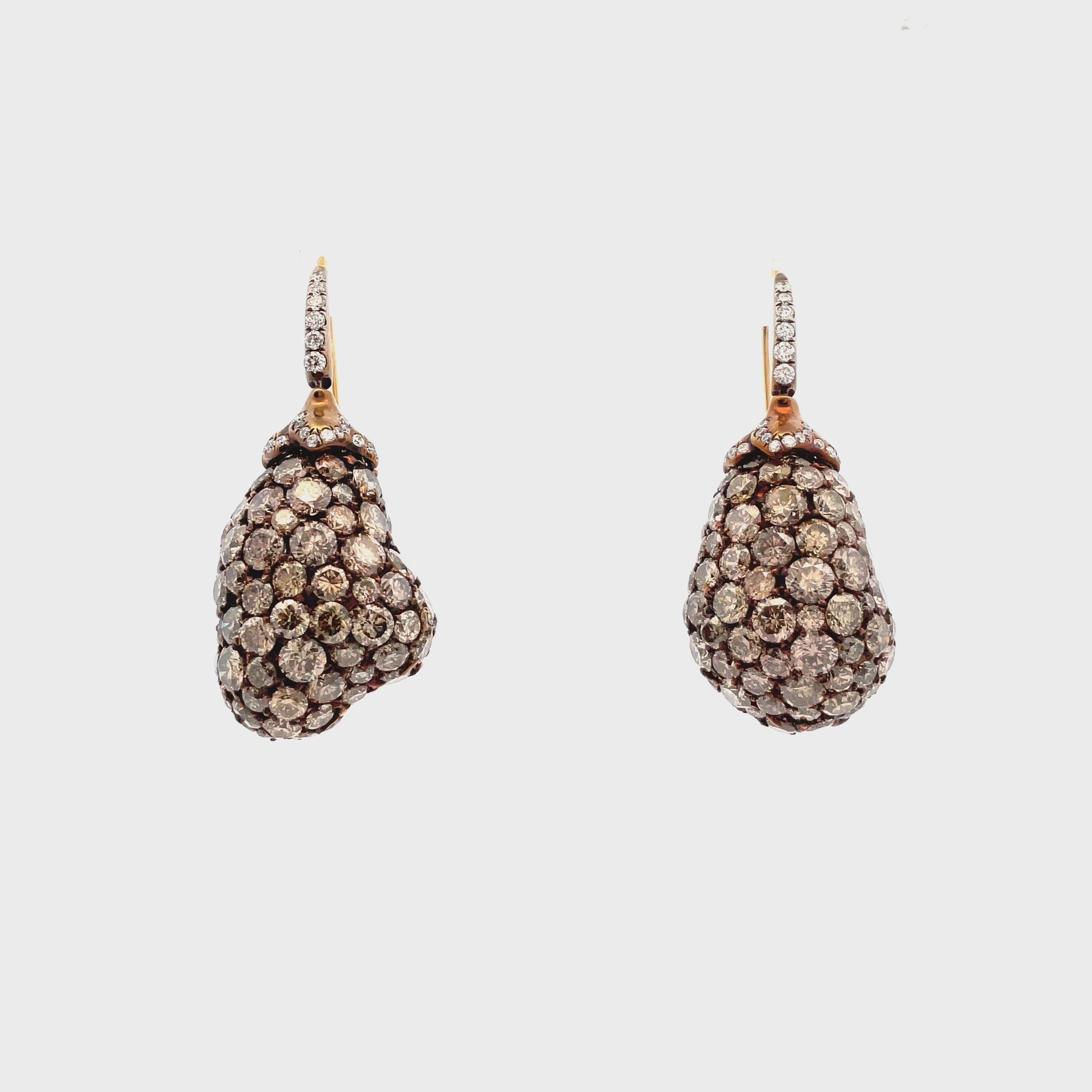 Eggplant-inspired earrings featuring a range of champagne color diamonds symbolize fertility and abundance, celebrating growth, achievement, and new beginnings.
