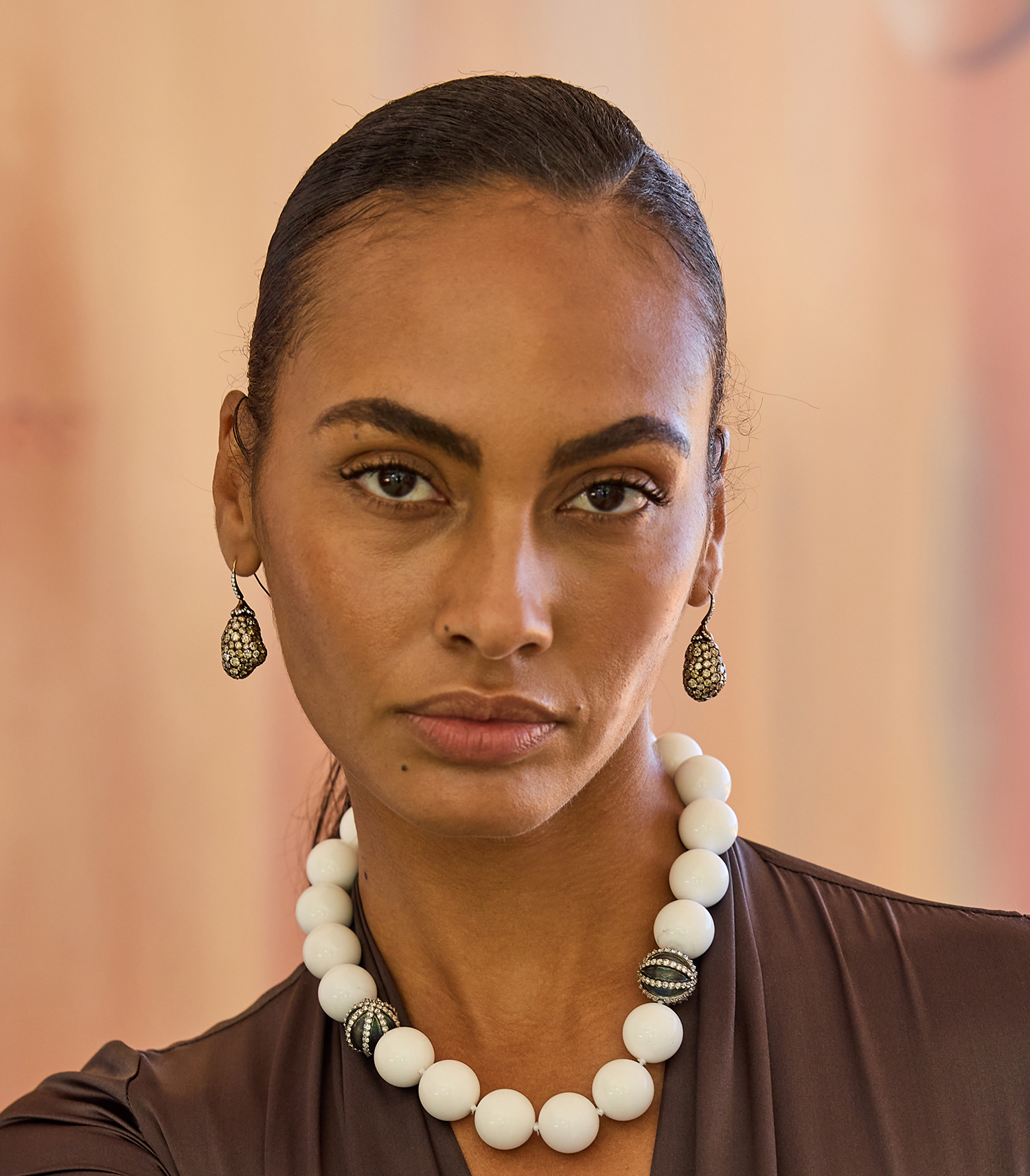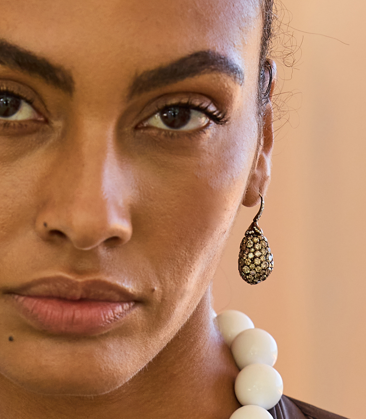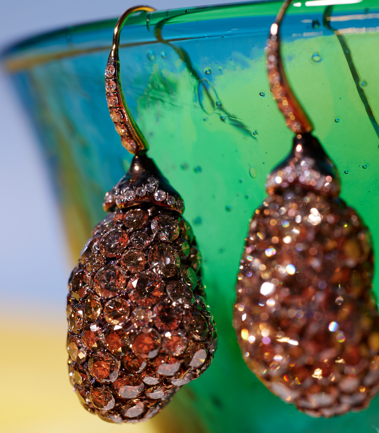 Eggplant-inspired earrings featuring a range of champagne color diamonds symbolize fertility and abundance, celebrating growth, achievement, and new beginnings.